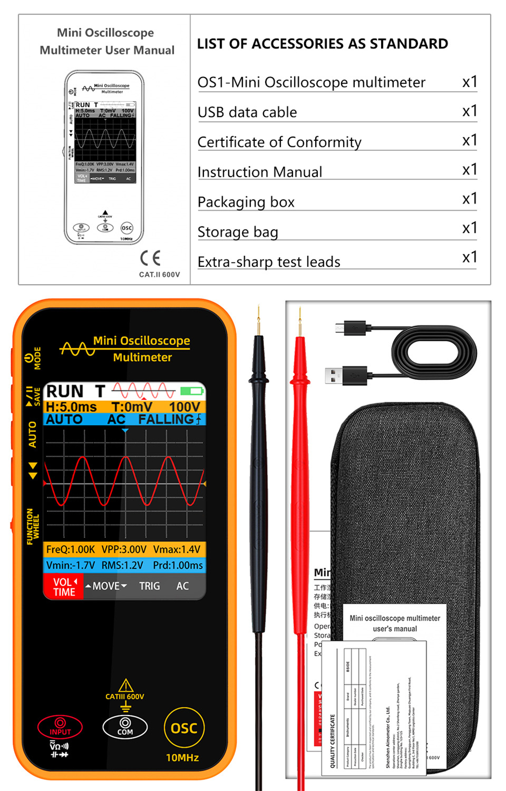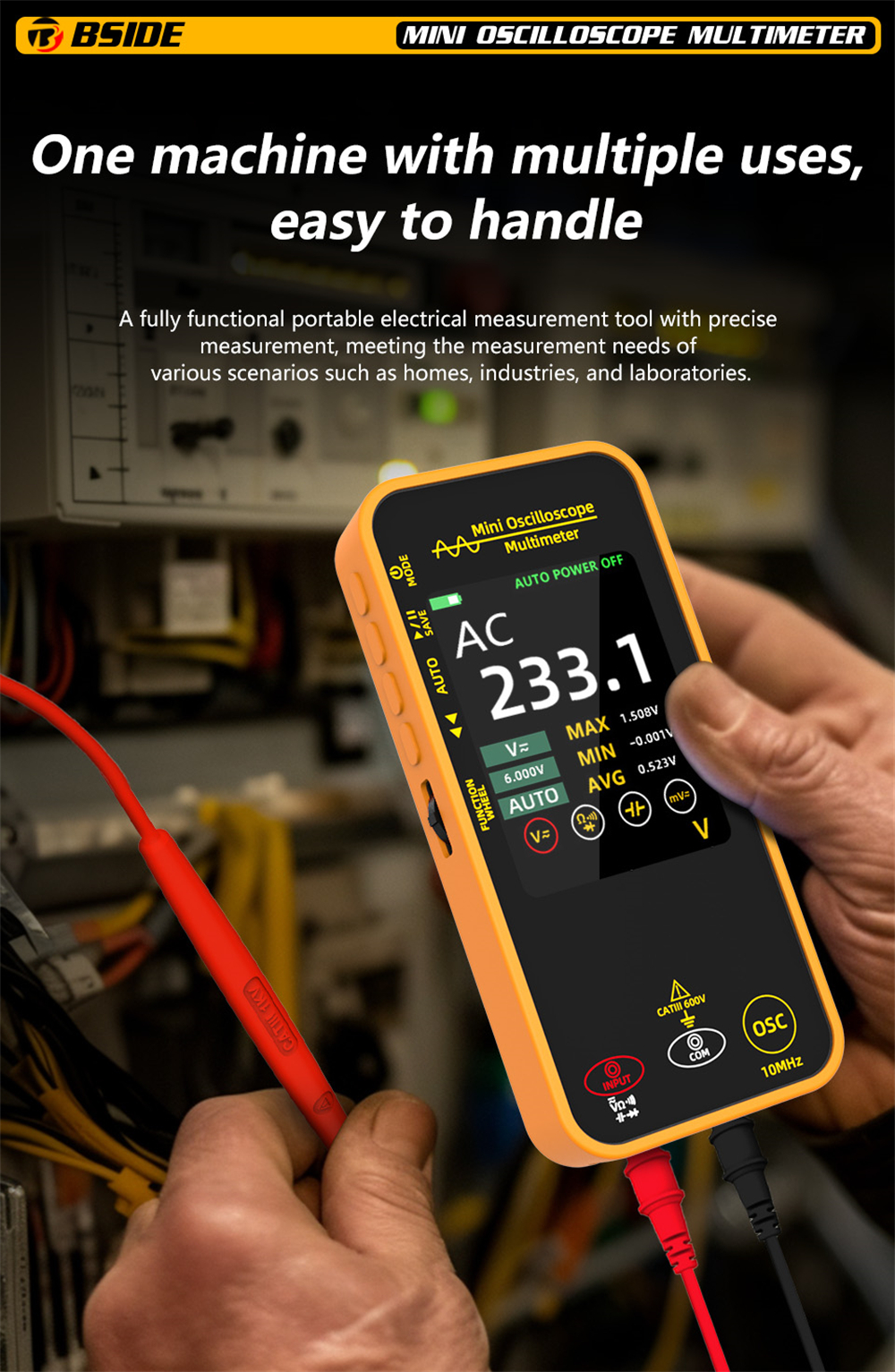 1.Multifunctional Design: Combines an oscilloscope and multimeter, offering multiple measurement modes in a single compact device that is versatile for professional and personal use.