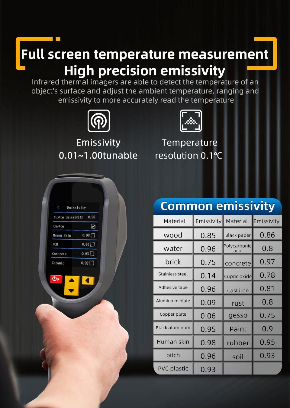 Customizable emissivity (0.01~1.00) allows accurate measurements across different surface types, enhancing versatility in both professional and personal use.