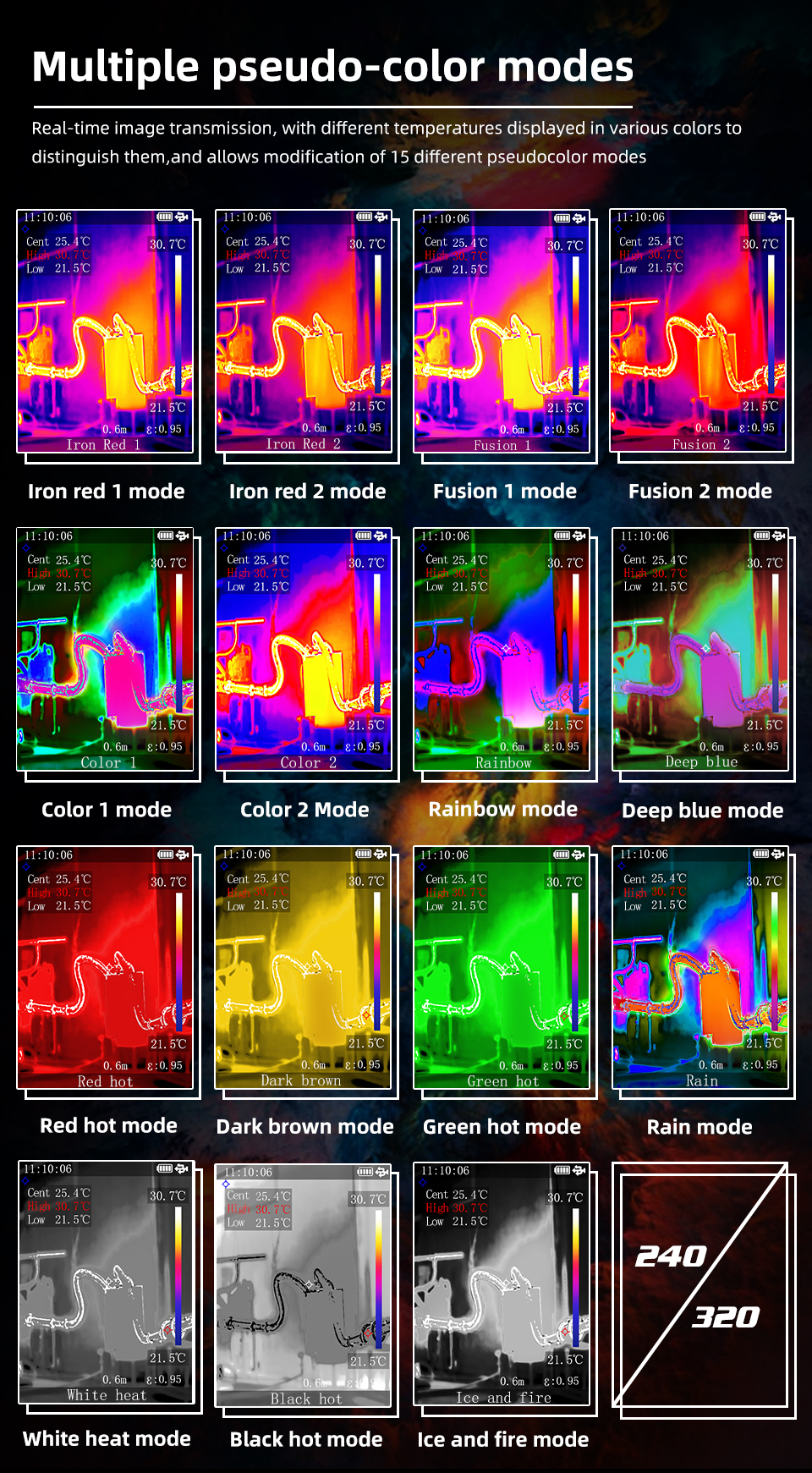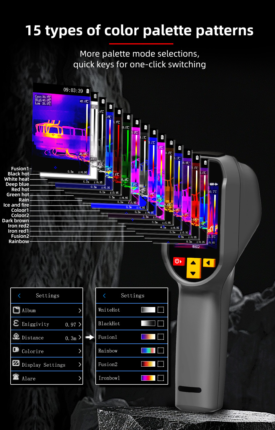A 2.4-inch TFT LCD screen with multiple color palettes provides vibrant visuals and simplified analysis, perfect for capturing detailed thermal readings.