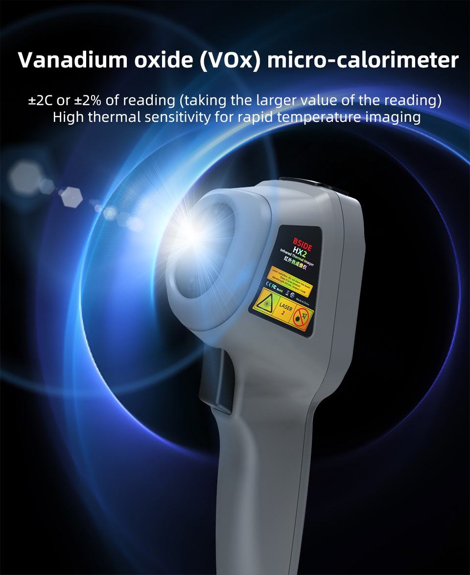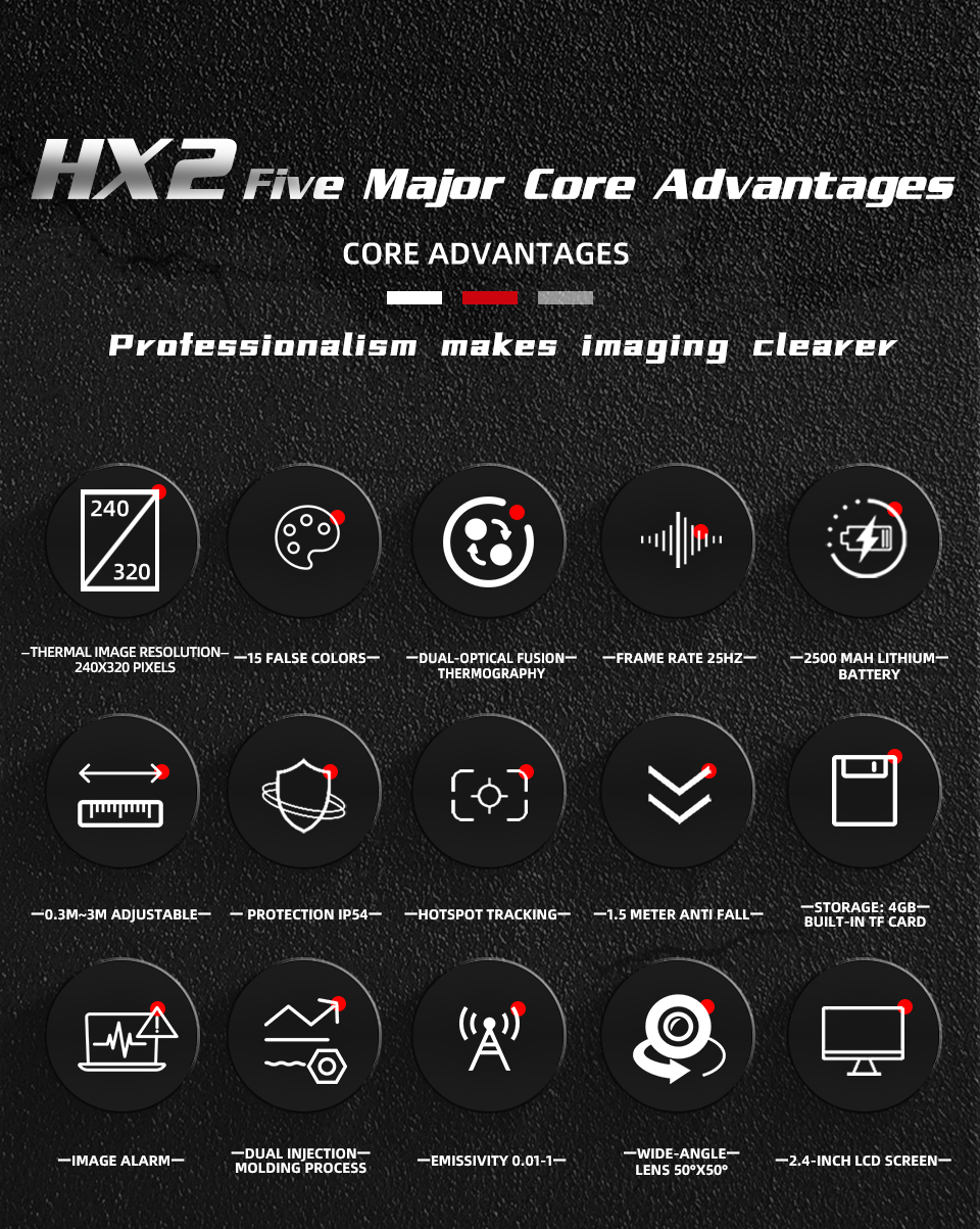 The HX2 thermal imager features a 240x320 thermal image resolution, offering precise details to identify subtle temperature variations, ideal for industrial inspections and diagnosing mechanical components.